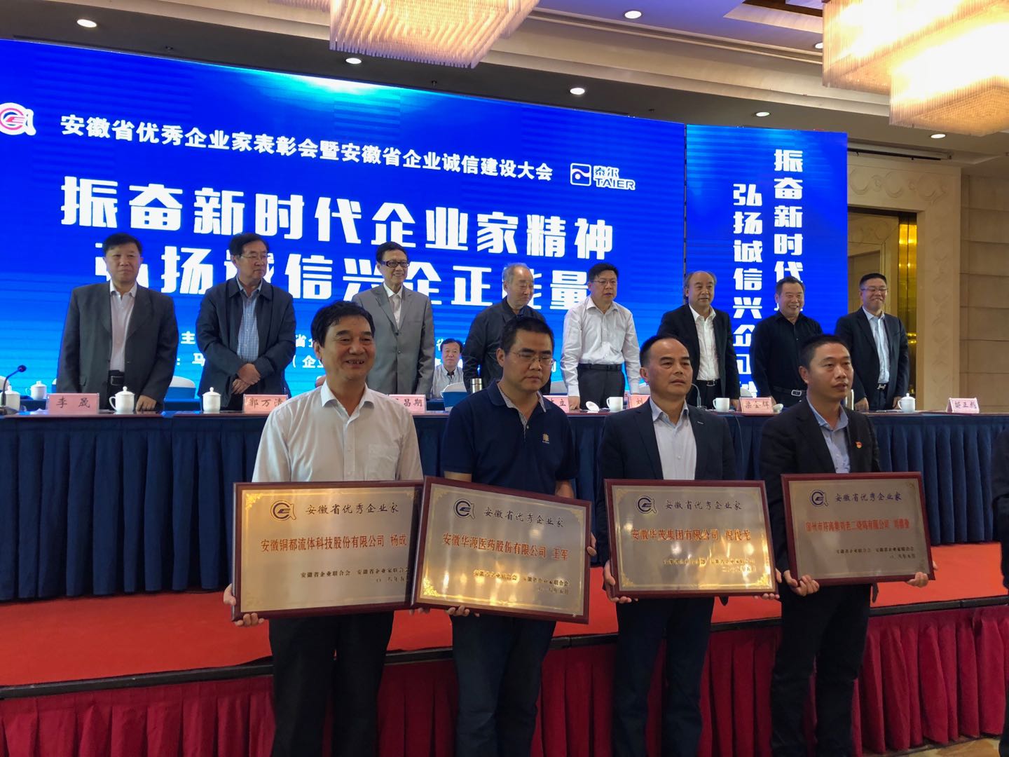 公司董事長楊成作為銅陵市代表,榮獲"安徽省優(yōu)秀企業(yè)家"榮譽(yù)稱號,并出席了安徽省優(yōu)秀企業(yè)家表彰會暨安徽省企業(yè)誠信建設(shè)大會頒獎儀式。