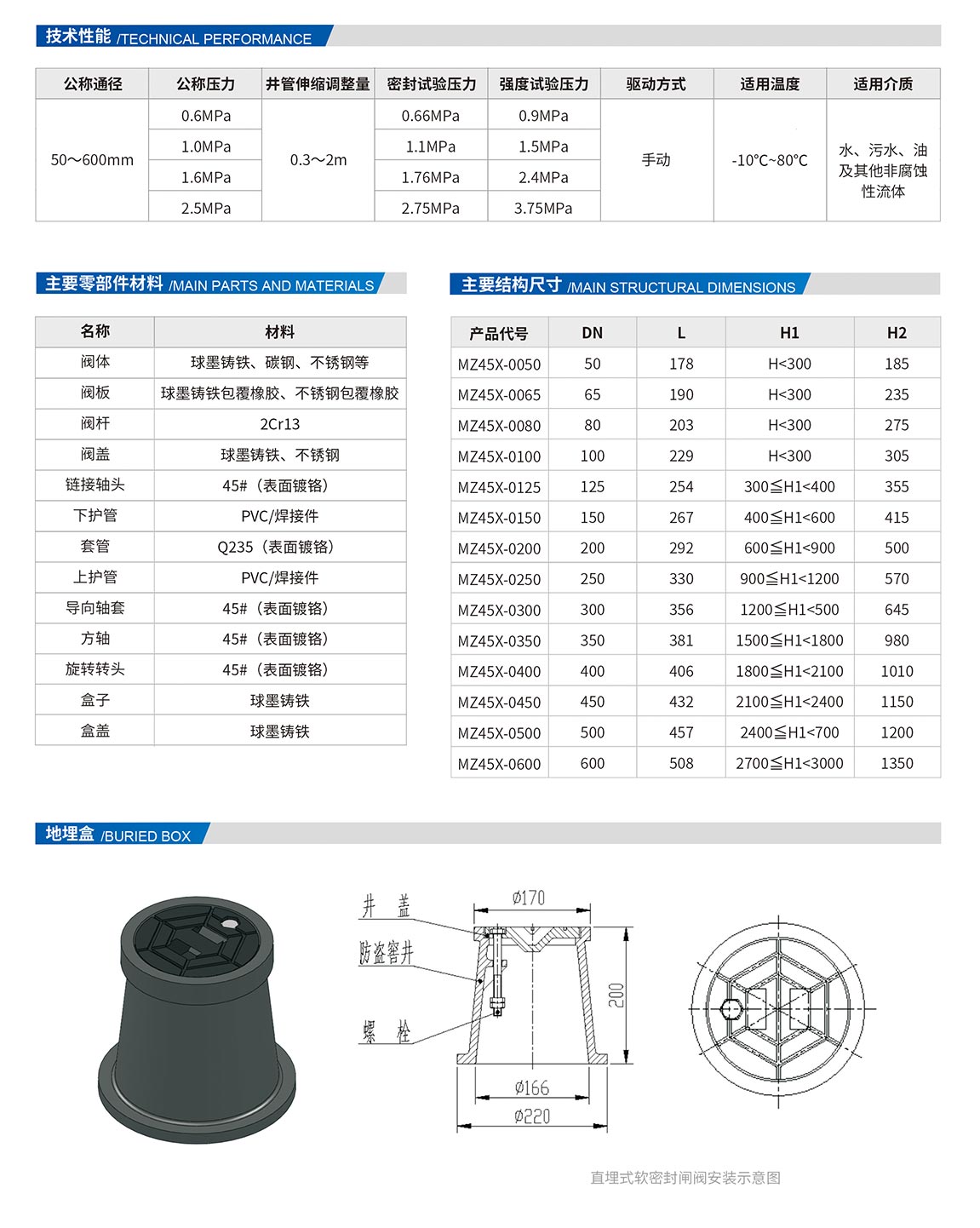 傳統(tǒng)閥門安裝方式是將閥門安裝在閥門井內(nèi),但是閥門井造價(jià)高、影響美觀、下井操作不方便、井蓋常丟失或人為損壞,在人行橫道及汽車行使路面等場(chǎng)合易造成危險(xiǎn),“馬路驚魂”的現(xiàn)象層出不窮。由此,為解決這些問題,結(jié)合軟密封閘閥結(jié)構(gòu)穩(wěn)定、耐用等特點(diǎn),一種新概念的“直埋式”軟密封閘閥應(yīng)運(yùn)而生。